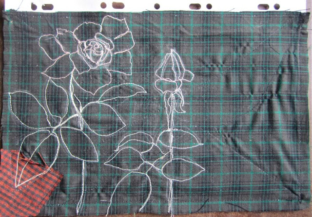I machine sewed straight seams in the fabric to make a shadowy 9-patch with an X from corner to corner, creating a grid or structure to work on. Then I hand basted this to an old piece of white cotton for backing and hand stitched down the seams (should have stitched the seams first). Nice pucker effect.